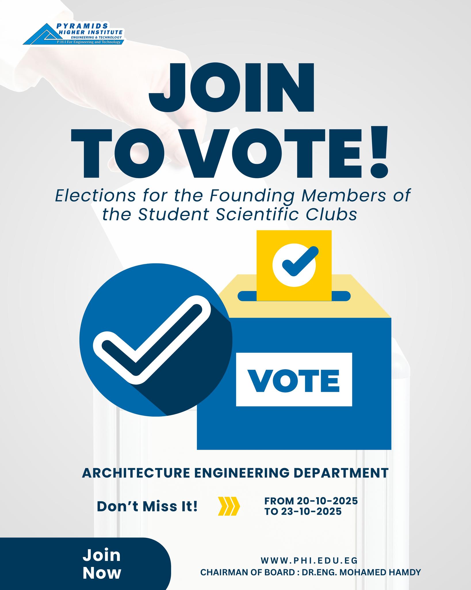 يُعلن قسم الهندسة المعمارية بـ معهد الأهرامات العالي للهندسة والتكنولوجيا، وضمن فاعليات اليوم العلمي، عن إطلاق مسابقة تفاعلية متميزة تهدف إلى تعزيز التجربة التعليمية الواقعية للطلاب جنبًا إلى جنب مع السياق النظري للدراسة، وترسيخ الشعور بالانتماء لدى الطلاب والخريجين من خلال مشروعات حقيقية قابلة للتنفيذ داخل حرم المعهد. مسار المسابقة: